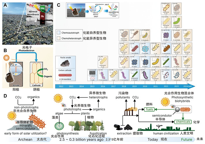 “矿物膜”受太阳光辐射作用产生的光电子能量,可促进非光合微生物的生长代谢,直接影响生境中微生物群落构成、胞外电子传递过程及效率与代谢活性等,深刻地影响着地球“关键带”一系列重要的地表生物地球化学进程[9-12]。鲁安怀等早在2012年就首次在国际上报道了可见光照射下天然半导体矿物如金红石(TiO2)、针铁矿(Goethite)和闪锌矿(ZnS)产生的光电子能量,能够显著增强氧化亚铁硫杆菌(Acidithiobacillus ferrooxidans)和粪产碱杆菌(Alcaligenes faecalis)的生物量,增长幅度可达1~3个数量级[10]。目前光电能微生物能量代谢理论已被国际同行广泛接受,并在国际上产生了重要学术影响。这也是我国科学家提出的原创性成果,在国际微生物相关研究领域起到了重要引领作用[13]。2024年,Wang等[14]对国际上微生物光电能营养新类型自发现以来的十二年陆续取得的系列研究成果进行了系统总结,展示了该研究方向在国际上蓬勃发展的新动向,在理论和应用上均显示出强劲的研究态势(图 2D)。