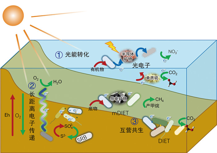 4 结论与展望半导体矿物产生的光电子和光空穴通过多种方式影响着微生物的生长和代谢。近年来的研究也将微生物光电能代谢广泛运用于合成生物学、人造光合系统、工业污染治理等多个领域。研究微生物如何利用矿物光电子和价电子能量,建立互营共生关系,构建能量传递网络,对提高光电能量转化效率十分重要。特别是在寡营养、低能量的环境下(如海洋透光层),微生物可能形成独特的能量获取和代谢方式(图 8)。随着基因工程技术手段的不断发展,人们利用基因编辑技术,如CRISPR/Cas9技术可以精准地修改微生物的基因组,从而增强其光合作用能力和电能转换效率,如通过改造与光合途径、电子传递链和代谢产物合成等相关的基因,来优化微生物的光电能代谢效率[54, 55]。另一个有效的策略是使用人工辅因子,以提高能量转换效率。通过酶工程,可以设计目标酶使其高效利用由正交人工辅因子传递的能量,从而绕过细胞内的通用能量系统[30, 56, 57]。