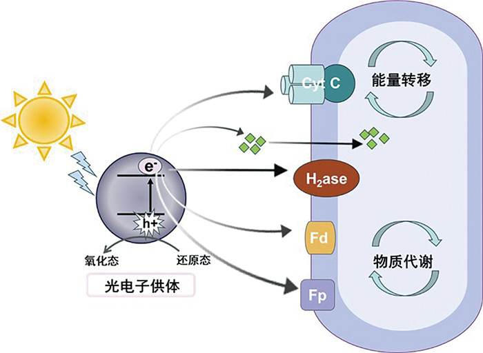 近年来,众多新型导电聚合物和纳米材料的出现,也极大地提升了微生物能量转化的性能。通过构建适合微生物生长的电极材料,可以实现更高的电子转移效率和更好的生物相容性[58]。但是光电能转化效率低下限制了半导体-微生物杂合系统的大规模运用:一方面,微生物光电能代谢本身存在较多能量耗散过程,例如光捕获[59]、电子传递[60]和化学能转化等过程;另一方面,材料的成分和反应条件都会显著影响微生物的光电转化效率,材料的光电响应能力[61]和生物兼容性[62],及对微生物生理状态的研究都有助于提升微生物的光电转化效率。目前对微生物光电能代谢机制的了解微乎其微,只涉及少数具有已知胞外电子传递的微生物[63],并且无法确定具有胞外电子传递的微生物能否同时具备光电能代谢功能。此外,光电能代谢过程中涉及多种跨膜蛋白、电子传递链及相关的代谢途径,研究其机制需要借助基因组学、蛋白质组学及代谢组学等生物信息方法,需要做到深入的学科交叉。