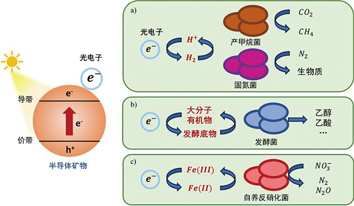 (a)微生物通过氢气间接利用光电子;(b)微生物通过有机物间接利用光电子;(c)微生物通过变价金属间接利用光电子 图 5 微生物间接利用光电子的方式 |