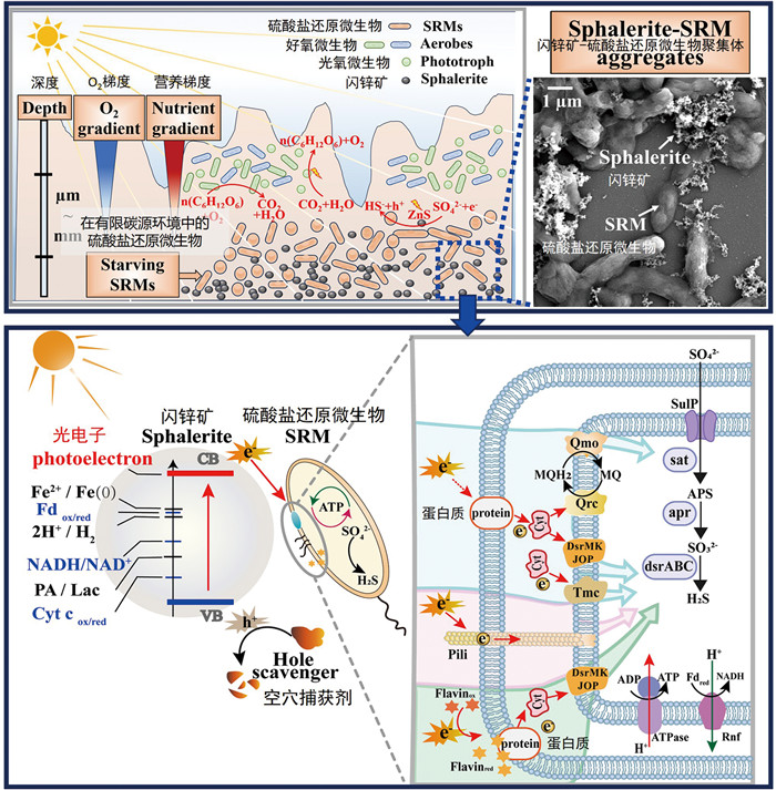 图 6 低能量生物膜中硫酸盐还原菌摄取闪锌矿光电子的机制[43] |