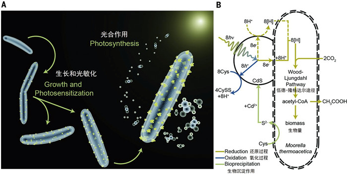 (A) CdS光电子加快M. thermoacetica产乙酸速率;(B) M. thermoacetica-CdS系统的通路图[27] 图 7 乙酸菌利用CdS光照下产生的光电子固碳产生乙酸 |