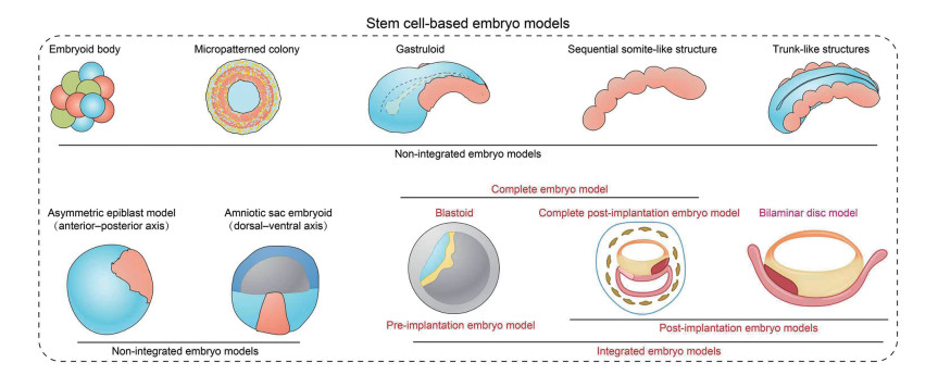 4 人胚胎模型研究进展用胚胎作为研究材料,是揭示人早期发育奥秘的基础,但面临诸如伦理关切、资源稀缺和技术挑战等限制,因此无法用其进行深入和系统的发育机制和功能研究。此外,供体年龄、职业、遗传背景和健康状况等因素还会造成胚胎的异质性。胚胎模型是利用一种或多种干细胞在体外构建的,能够在分子特征、细胞谱系组成及组织结构等方面模拟人胚胎发育过程中关键事件的细胞培养物。干细胞通常包含全能干细胞、多能干细胞、滋养层干细胞和胚外内胚层干细胞。干细胞来源的胚胎模型,可以大规模制备,均质性和可控性好,且容易进行基因编辑和谱系示踪等操作。如果能实现胚胎模型在形态结构、分子特征和发育潜能上与人胚胎高度相似,胚胎模型将与体内自然发育和体外延长培养的人胚胎形成互补,并完美地破解当前人早期胚胎发育研究过程中所面临的瓶颈问题。因此,对于人着床后早期胚胎发育而言,胚胎模型具有广阔的应用前景。