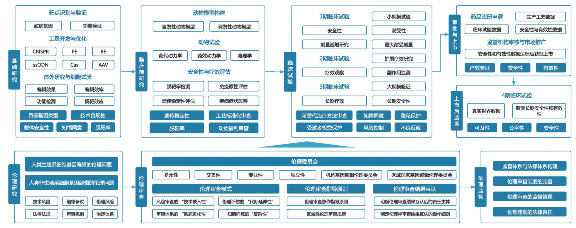 二是完善贯穿研发全周期的伦理安全审查体系。基因编辑技术的伦理安全风险随着研发进程而变化,需要实施分阶段管理。临床前阶段应重点完善长期毒理学评价和生殖系转移风险评估;临床阶段强化实时监测与长期随访机制,重点关注受试者权益保护,并动态追踪脱靶情况;上市后阶段应建立基于真实世界数据的安全预警体系。