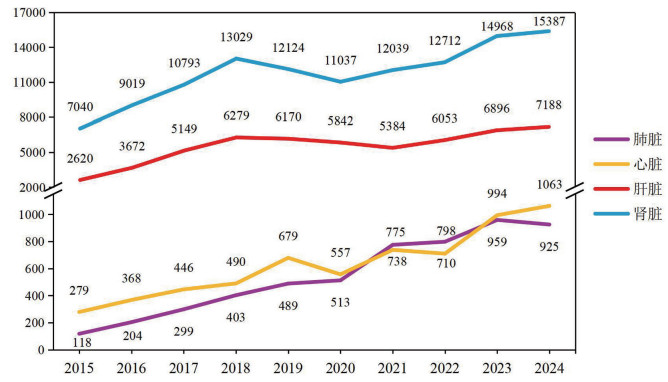 截至2024年底,已办理人体器官移植诊疗科目登记的医疗机构共187家(包括获批的47家人体器官移植培训基地)(图 1),注册人体器官移植执业医师2 645名[12, 13]。2015年至2024年,共完成器官移植185 209例(图 2)[14, 15]。