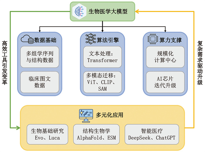生物医学大模型作为面向生物医学领域设计、基于超大规模预训练策略与多模态学习技术构建的人工智能模型,是人工智能与生命科学交叉融合的重要成果。一方面,生命科学领域长期积累的多模态生物医学数据,与信息时代所积累的海量通用文本数据,成为驱动人工智能模型系统演进的关键生产要素。另一方面,智能时代的算法迭代与算力基础设施的提升,促进了生物医学数据的深度挖掘与知识发现。这一协同演进体系以数据为基础、以算法为引擎、以算力为支撑,并通过多元化应用场景,实现了双向赋能:大模型技术为生物医学领域基础研究与应用提供了高效工具,而复杂多样的生物医学问题又反向驱动大模型架构的迭代升级。大模型技术与生物医学领域的深度融合,正以前所未有的速度推动两种学科的范式转型与跨越式发展(图 1)。