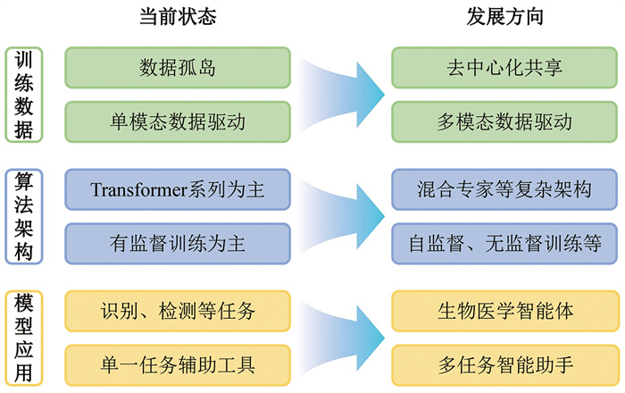 5 结论生物医学大模型作为人工智能与生物医学深度融合的产物,正以极快的速度融入各类生物医学应用场景,引发智能化范式变革,其未来发展不仅限于简单的技术迭代,更有机会促成生物医学认知方法论的重构。随着生物医学大模型的持续发展,其有望成为“生物医学领域的通用智能体”,实现从“辅助工具”到“智能协作者”的转型,并在基础研究、工业运用、临床诊疗等领域引发更加深刻的变革,而生物医学的边界也将被重新定义。