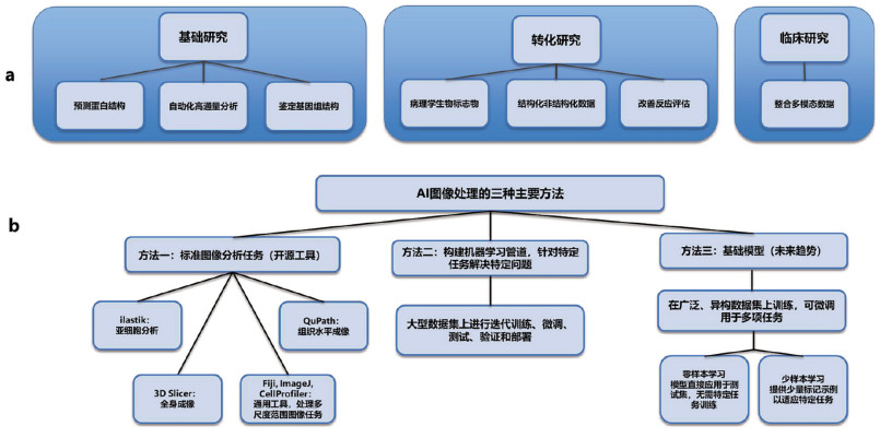 3 人工智能在肿瘤基因数据处理中的典型任务与案例 3.1 人工智能技术在肿瘤基因分析中的应用概述人工智能技术包括机器学习和深度学习方法,已被广泛应用于肿瘤基因数据的分析,其中患者的诊断是最常见且最重要的应用之一[10, 39]。图 1直观地展示了人工智能在肿瘤研究中的典型工作流程。该流程概括了从基础研究(例如a部分所示的蛋白质结构预测、高通量分析、基因组结构识别)到转化研究以及临床研究的各个阶段(例如a部分同样提及的病理标志物识别、响应评估和多模态数据结合)。图 1的b部分具体描绘了人工智能(AI)图像处理的三种主要方法。方法一是标准的图像分析流程,涵盖了从3D切片到亚细胞级别的多尺度分析。方法二则阐述了构建机器学习管道的关键步骤,包括样本准备、模型训练、参数调整、测试验证及最终部署。值得注意的是,方法三强调了基础模型(foundation models)的应用潜力,它们能够利用海量数据和预训练能力,通过少样本学习、零样本学习或直接应用来解决特定问题。除了传统的机器学习方法,图神经网络(GNNs)作为一种在非欧几里得空间进行深度学习的分支,在处理具有复杂关系结构的图数据方面表现尤为出色,并已迅速成为生物信息学领域中不可或缺的重要工具[40]。知识图谱则通过将生物医学领域中的各种实体(例如基因、疾病、药物)及其之间的复杂关系表示为图结构,极大地促进了对异构生物医学数据的整合、高级推理和新知识的发现[41, 42]。值得一提的是,大语言模型(LLMs)虽然最初主要应用于自然语言处理领域,但通过针对特定任务进行微调以及结合领域知识库进行增强,在识别基因与表型之间的关联方面也展现出令人印象深刻的准确率[11]。这些不同的AI技术相互补充,共同推动了肿瘤基因数据分析能力的不断提升[9]。